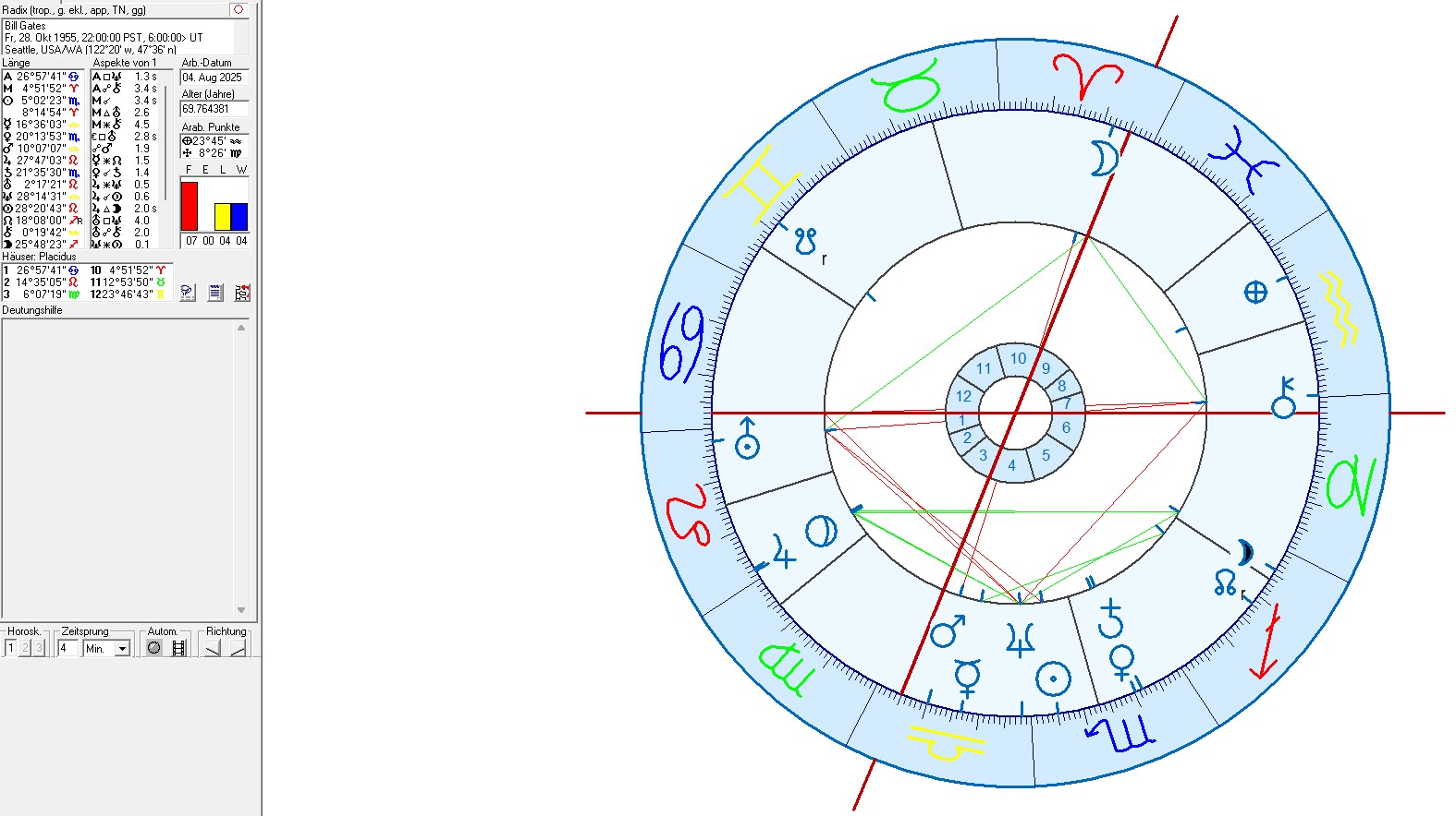 • Evaluation: In Bill Gates` birth chart Gemini stands for the 12th house with the topic of true identity. This indicates that the site has been chosen as a kind of retreat or hiding place selected with the priority of feeling undisturbed by the public here. This astrogeographic aspect can frequently be observed with residences of celebrities. It seems to support feeling and being energetically as wqell as practically less disturbed by fans, the press or other factors.