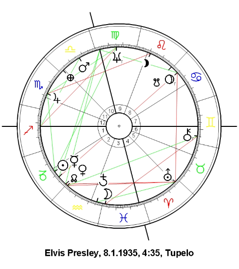 - 29°SCORPIO: the aspect stimulated house 12 in Elvis birth chart indicating a personal retreat from his global impact but also a transcendental approach to it. There was no need for Elvis to tour in Europe nor in the rest of the world. Anyway he was “virtually” present through his recordings and movies. The position in House 12 allowed him to stay transcendental but also kept him out of reach for people from far away places.