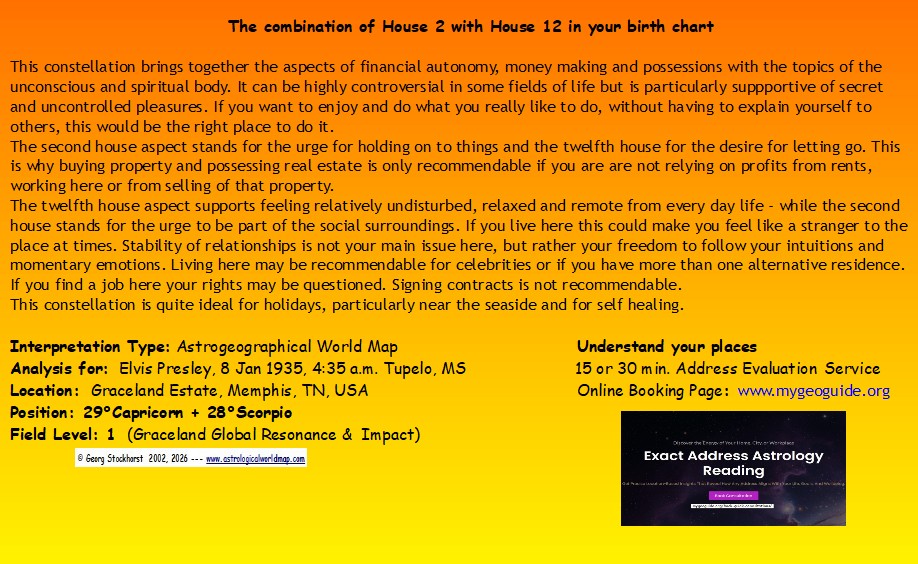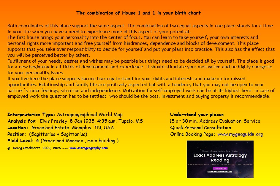 The comparison of the astrogeographical constellation of the place with the birth chart of Elvis (born with the Sun in Capricorn and Ascendent in Sagitarius) offers the possibility to draw conclusions about: