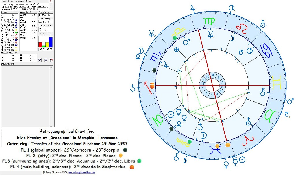 Field level 4 (exact position of a building, appr. 80 m x 120 m): Both coordinates of the Graceland Mansion right on Elvis Ascendant in Sagittarius