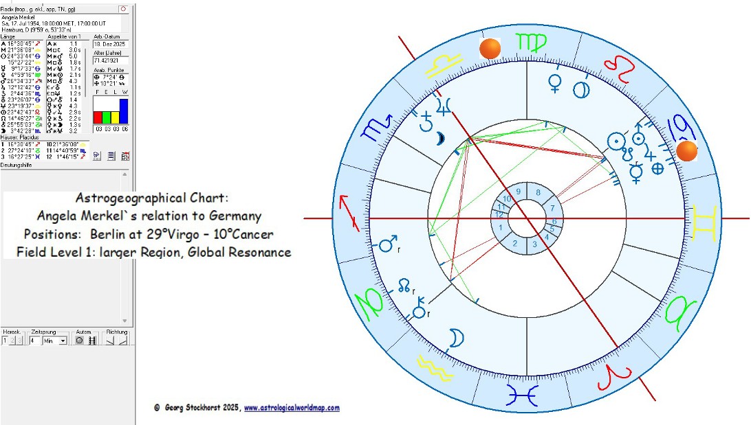 - Aus astrogeographischer Sicht ist die Hauptwirkung von Angela Merkel insofern auf den 10°Krebs Aspekt hin zu deuten..