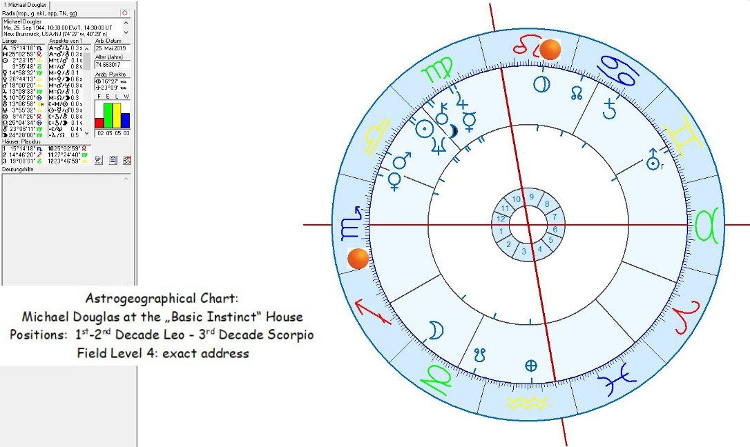 Michael Douglas and Sharon Stone at the “Basic Instinct House”. Astrology, people and places: The astrogeographical position of the film location in relation to the actor`s birth charts.