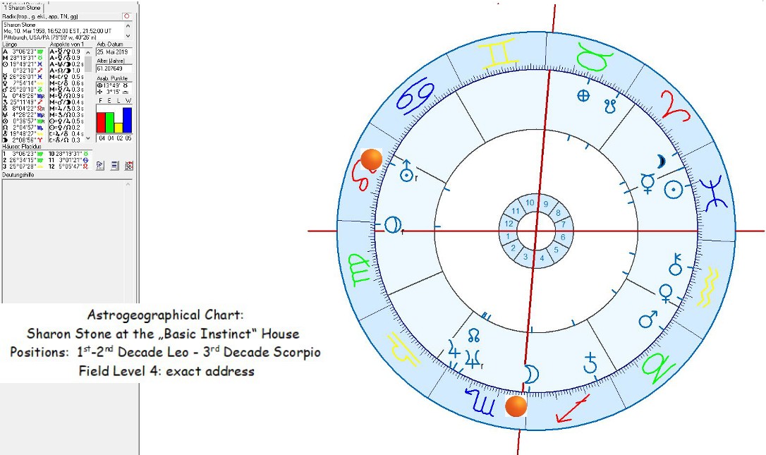 • The astrogeographical coordinate in the last degrees of Scorpio triggered house 4 in Sharon Stones birth chart. This particular filming location can so be assuemd to have stimulated in her psyche the feeling at home, relating to her personal emotions and private space, the resonance with the sexual organs particularly vagina and uterus,