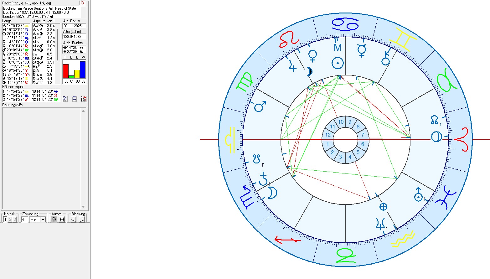 - Field Level 3 (surrounding area of the building – field size ca 1 km x 1.4 km): Buckingham Palace is located in the sign combination Cancer – Scorpio