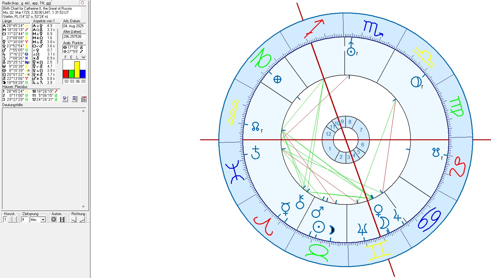 The birth chart of Catherine the Great of Russia compared to the astrogeographical position of Winter Palace in Saint Petersburg.