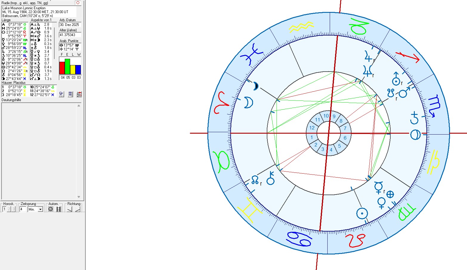 - The position of the ascendant and house system in the astrological chart for the limnic eruption at Lake Mounon is approximate but not exact to the minute.