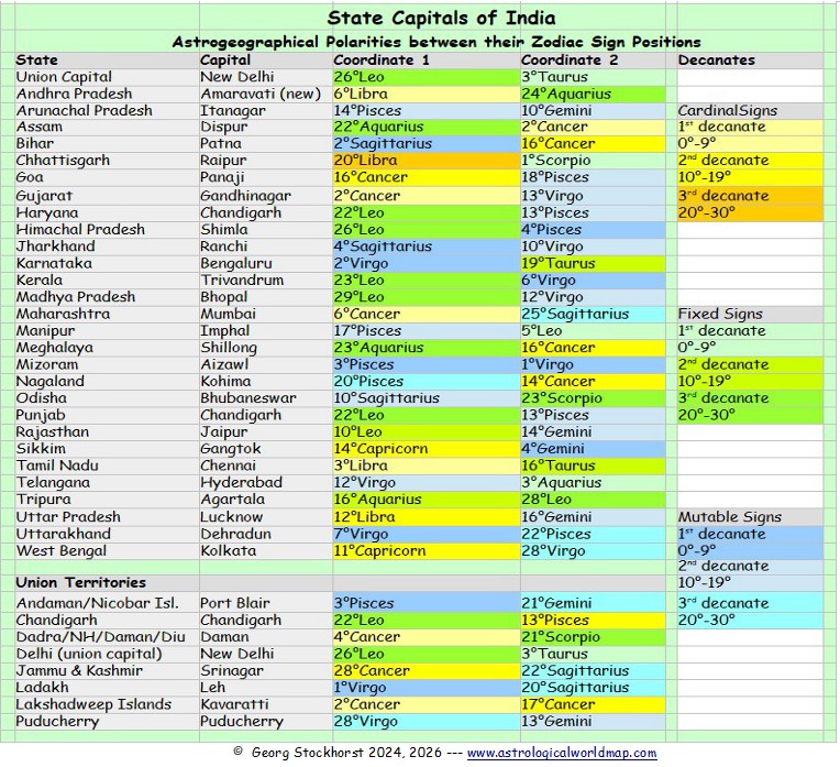 - The positoon of each state capitals can be explored as a hint at the quality of the contribution of the state to the nation, its inner qualities and issues and also of the status quo of the inner situation of a state government during the astrological transits of the 12 planetary sign in relation to capitals.