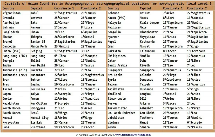 Astrological World Map Positions of Capitals worldwide according to my calculation system. For interpretation in Mundane and Political Astrology.