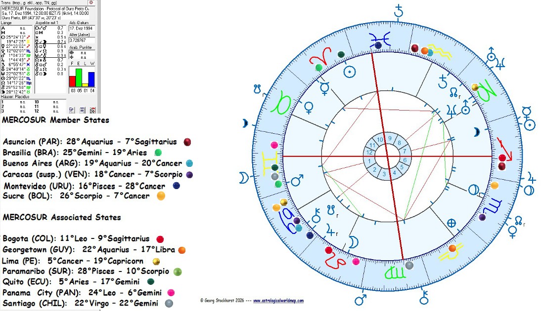 Astrogeographical Foundation chart for MERCOSUR calculated for the Treaty of Asuncion of 26 March 1991 with Transits for the Customs Union agreed upon in the Protocol of Ouro Preto outer ring). Both calculations are for midday. I added the astrogeographical positions of the national capitals for Field Level 4 (global impact) in colours.