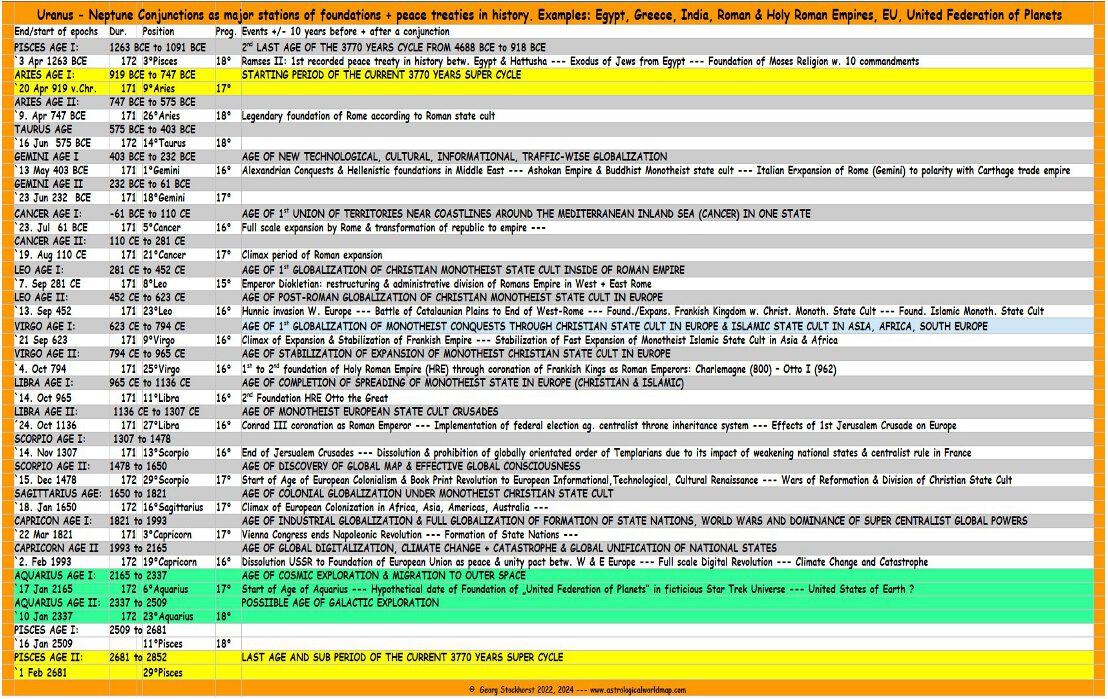• URANUS- NEPTUNE CONJUNCTION: The conjunction of Uranus (globalization, emancipation) with Neptune (transcendence, unity) the “final sweeper of history” of 2 Feb 1993 was the 2nd of two conjunction of the current CAPRICORN AGE (1821 to 2165). of 22 March 1821 – the 1st of the 2 UR-NE conjunction in Capricorn – had encountered the independence of South America from Spanish and Portuguese colonial rule.