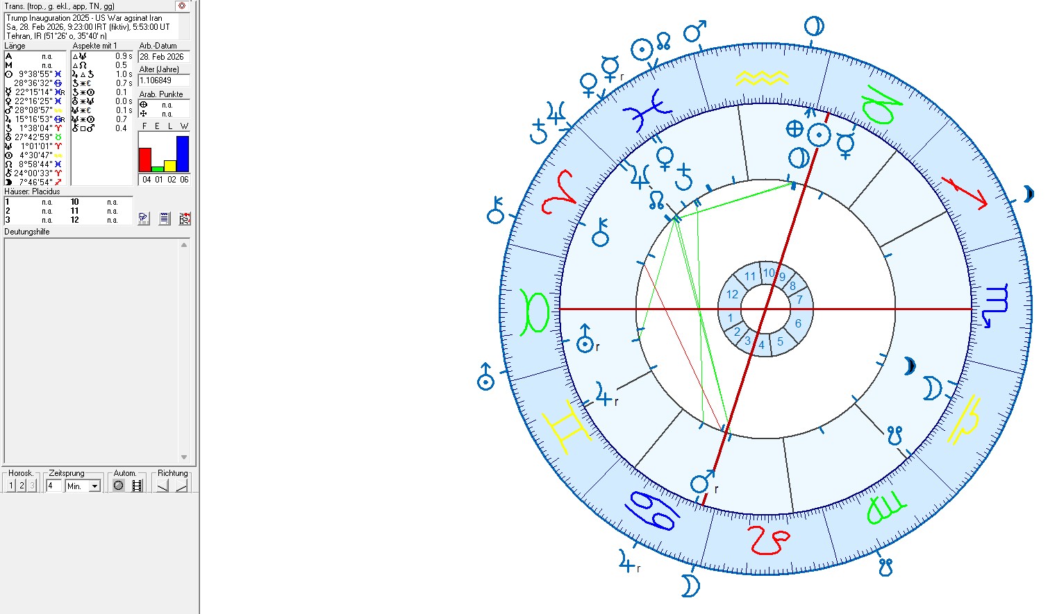 Rhythmical acitvations of aspects within the Trump II inauguration chart and transiting planets at the start of the war on 28 March 2026