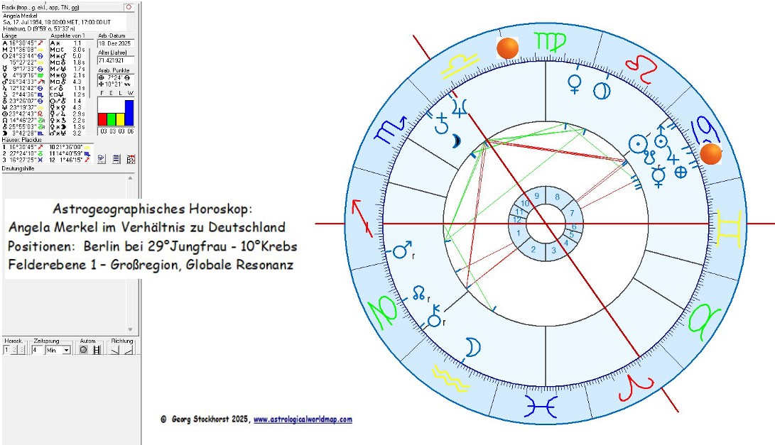 - Aus astrogeographischer Sicht ist die Hauptwirkung von Angela Merkel insofern auf den 10°Krebs Aspekt hin zu deuten..