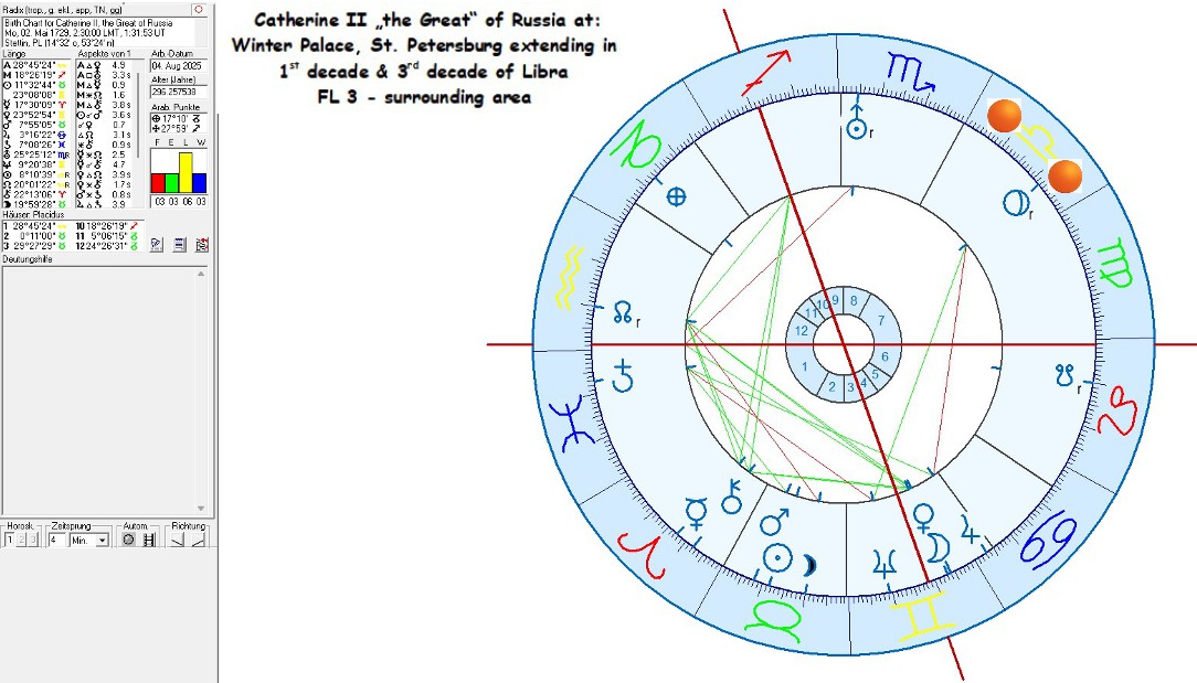 so ausführen, als wolle sie ein Publikum damit beeindrucken. Das siebte Haus steht hier durchaus auch für Ruhm und ist als Grundlage für öffentlichen Erfolg zu bewerten. Ein Hauptaspekt des siebten Hauses ist die Beziehungsbezogenheit, die der Ort im Leben von Katharina besonders gefördert haben dürfte. Nachdem Sie einen Putsch gegen ihren Ehemann angeführt hatte und diesen hatte hinrichten lassen, war der Weg hier für sie frei ihr Liebesleben im Stile eines männlichen König mit einer langen Liste von Liebhabern auszuleben. Die Konstellation des siebten Hauses steht nicht dafür, dass Katharina sich tief in den Traditionen des Ortes oder des Amtes verwurzelt fühlte und zeigt auch nicht an, das der Winterpalast für sie ein zuhause oder ein eigenes Territorium war. Im Gegenteil: das siebte Haus steht immer ein stückweit für den öffentlichen Raum.