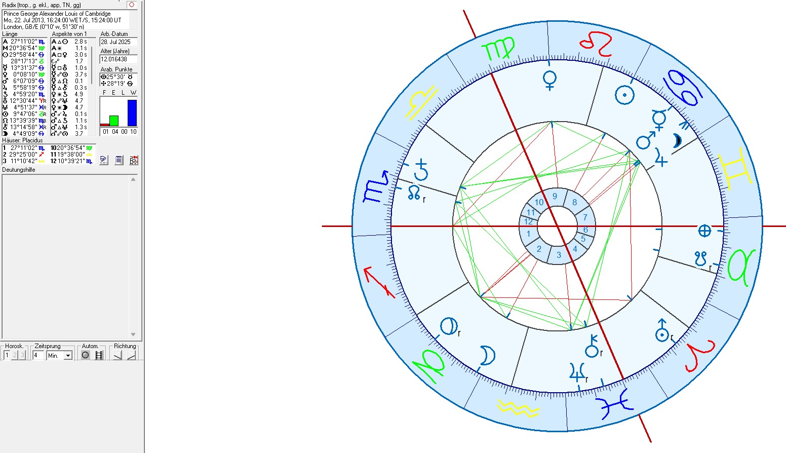 - Die Kombination des Sonnenzeichen Krebs und des Aszendenten Skorpion von Prince George Alexander entspricht genau den astrogeographischen Koordinaten des Buckingham Palace. Dies könnte andeuten das das Kind ein intensives und tief verwurzeltes Verhältnis nicht nur zum Ort des Königspalastes sondern auch zum Hof und Königtum hat.