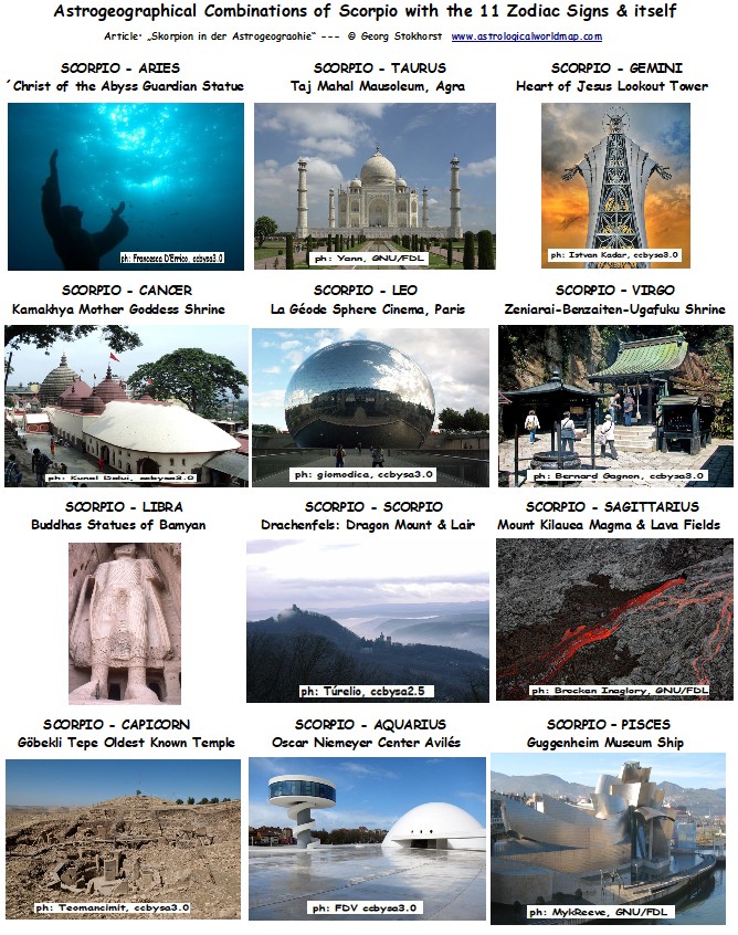 Artikel: Skorpion als astrologischer Resonator für Haifische und die Bedeutung des Goldrauschs im Zeichen Skorpion, Utroba Cave – a Vagina or Womb Cave Temple, Astrology and Architecture: Shapes of Scorpio, Scorpio as the sign of sculpting, Der „Christus der Abgründe“, Shiva in Cancer with Scorpio, The 12 Jyotirlinga in astrology, Die Freiheitsstatue Löwe – Skorpion, Sri Gomateshvara Statue Skorpion-Stier, Die Festung Sigiriya Christo Redentor Statue in Rio Skorpion-Löwe, Shiva in 2 Wasserzeichen Skorpion-Krebs, Buddhas von Bamiyan Skorpion-Waage, Bergheiligtum von Göbekli Tepe, Skorpion-Steinbock Jesus als Aussichtsturm in Skorpion-Zwillinge; Metalmorphosis in Skorpion-Jungfrau, Das Crazy Horse Memoria in Skorpion-Stier/Zwilling, Christus der Abgründe in Skorpion-Skorpion, The Kelpies Scorpio–Sagittarius, Golden Buddha of Wat Traimit Scorpio–Leo, Statue of Nostradamus, Das Fest der Menstruation von Mutter Erde.