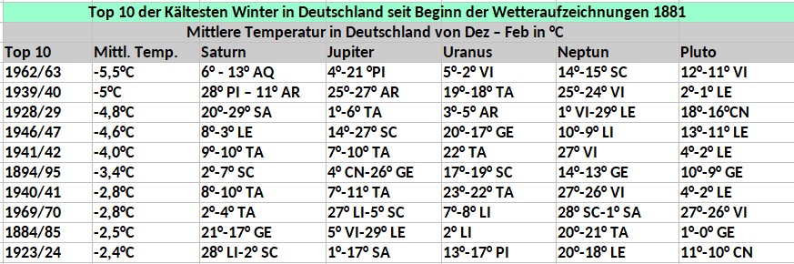 - Kein Planet im Steinbock: Während der 10 kältesten Winter stand keiner der Planetenreihe der 5 mittleren bis äußeren Planeten im Steinbock – dem Zeichen des ersten Wintermonats. Alle anderen 11 Zeichen waren wenigstens 1 mal vertreten.