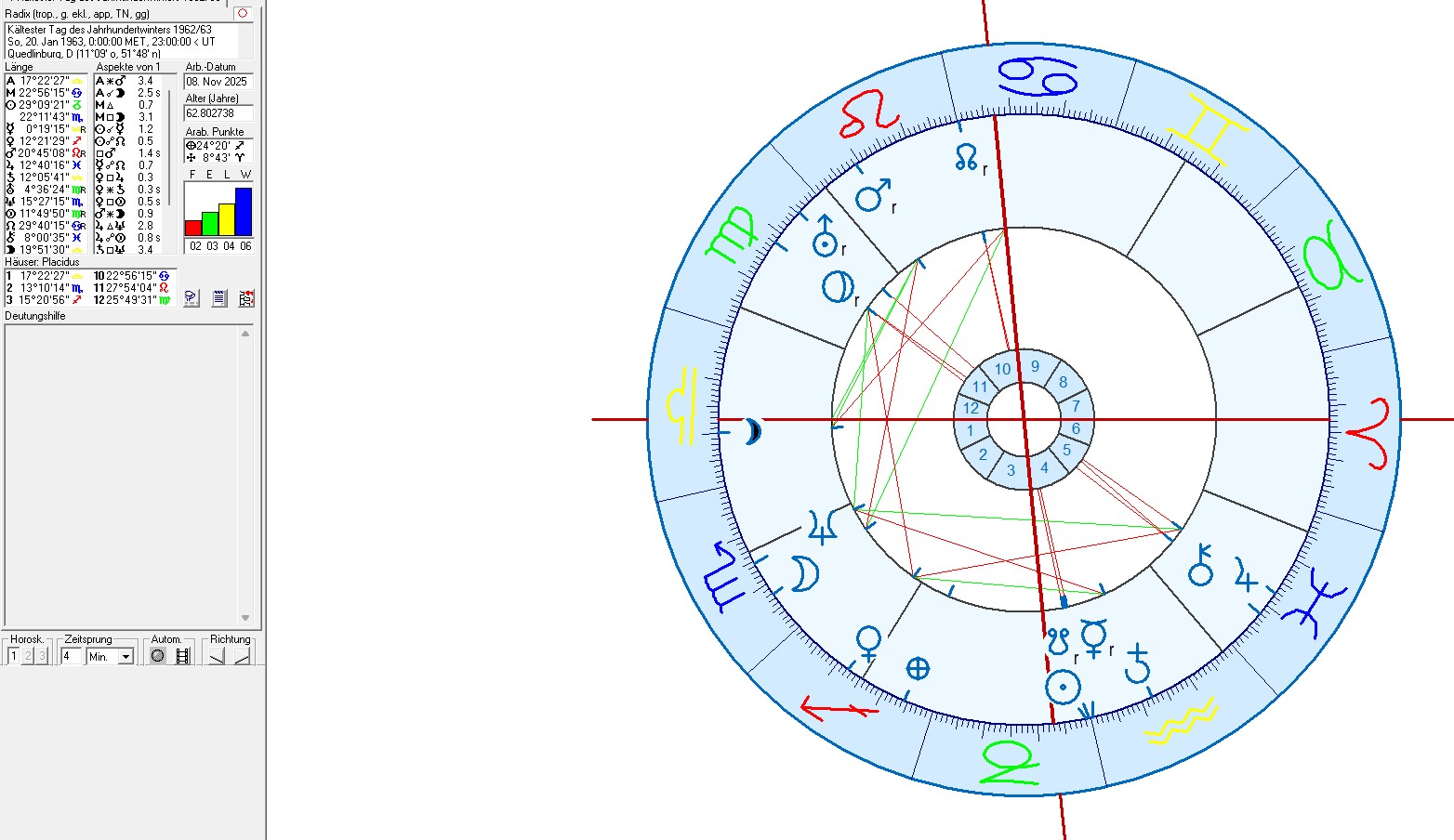 Zur Tabelle mit dem Astrologischer Vergleich der Top 10 der Jahrhundert – Winter in Deutschland & Horoskop für den Kältesten Tag im europäischen Rekord-Winter 1962/63: