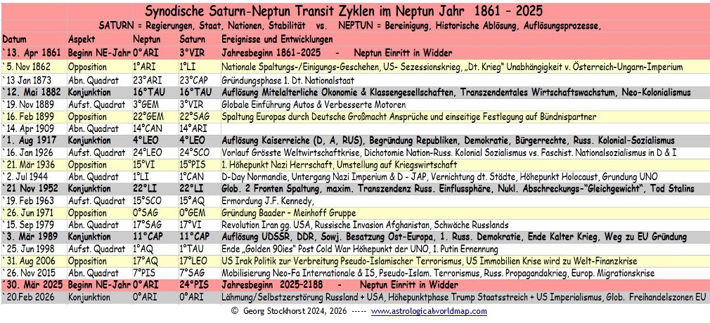 26. Januar: Neptun (Symbol: Dreizack) der Herrscher der Verbindung der 3 Welten (Erde, Sonnensystem, Kosmos), der Kosmische Bereiniger (Final Sweeper of History), Wettergott und Faktor der Transzendentalen Verbindung aller Materie und Wesen mit dem „Göttlichen Ursprung“ war bereits am 26. Januar in das Feuerzeichen Widder gewechselt und läuft sich jetzt dort für das Treffen mit Saturn am 20. Februar warm. 2025 hatte der astrologische Repräsentant des Meeresgottes Poseidon sich im ersten Anlauf schon vom 30. März bis 22. Oktober an der Wasseroberfläche manifestiert und den Kontakt zur Atmosphäre aufgenommen. Damit begann auch ein neues 165 Jahre dauerndes Neptun – Jahr in dem Neptun durch die 11 verschiedenen Stufen der Erdatmosphäre bei 0°Fische in den Übergangsbereich (0°-30°Fische zum Kosmos aufsteigen wird.